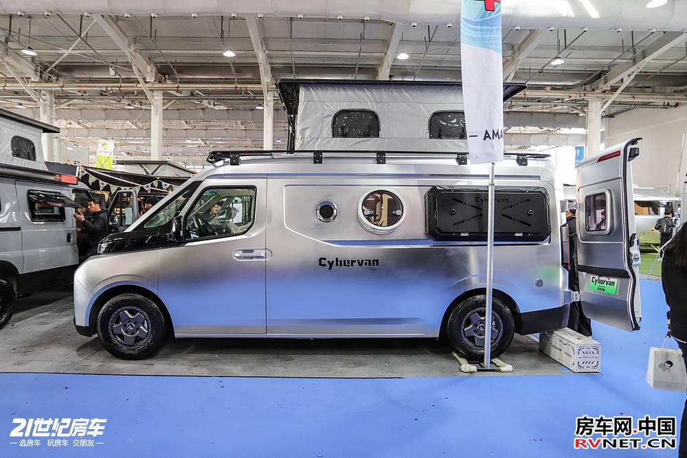 外观设计上,Cyber Van 走赛博机甲路线,太空银配色搭配全铝轻量化开模部件,视觉辨识度突出。车顶配备全域行李架,前部加装 ATS 组合射灯,户外气场直接拉满。