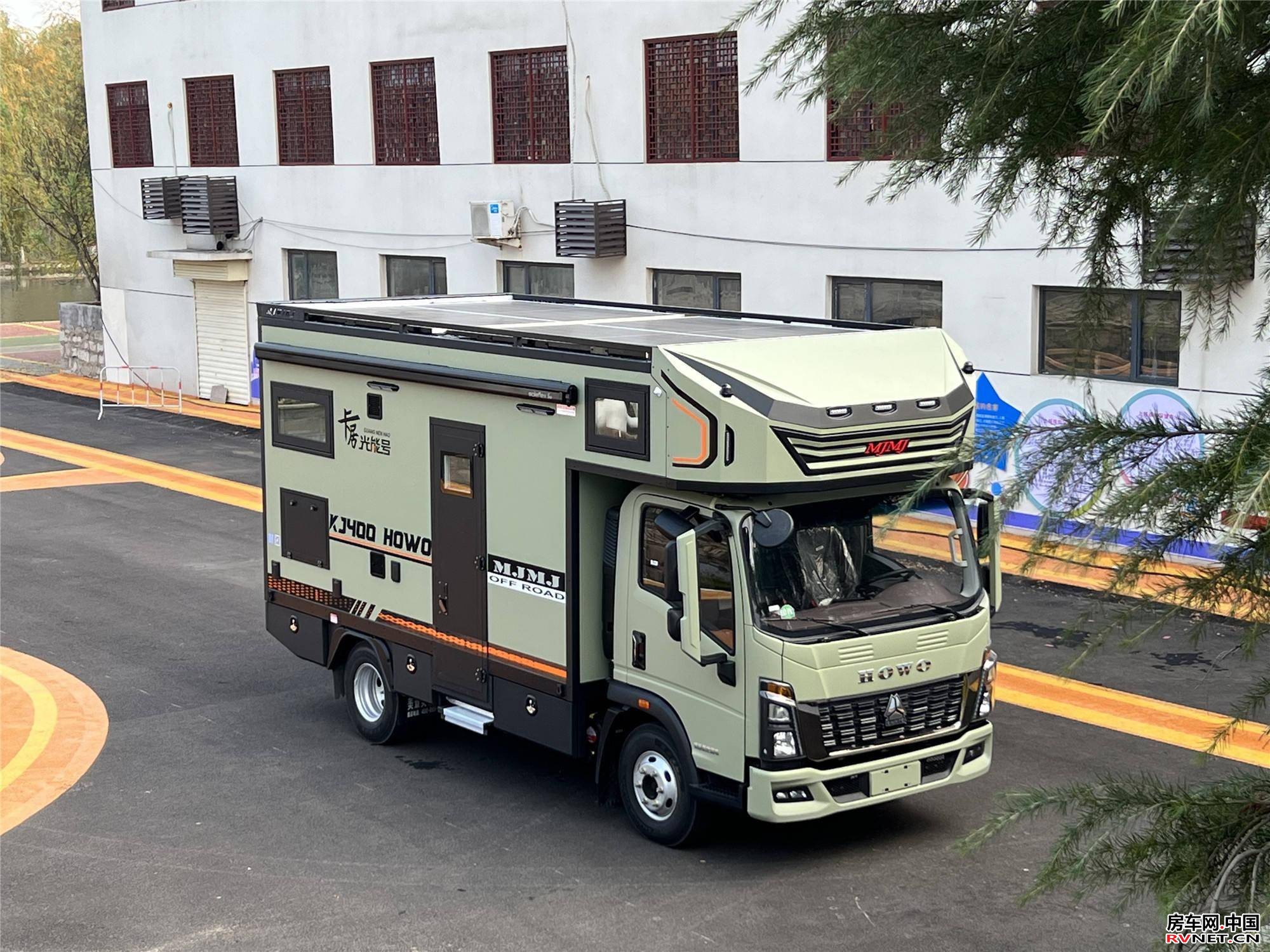 卡居400采用重卡级硬派设计语言,旷野绿与哑光黑的撞色涂装搭配金属镂空保险杠,营造出强烈的户外气息。车身高度较同级降低至3200mm,配合3308mm轴距,既保证了城市通勤的灵活性,又通过低重心设计提升了高速稳定性。车顶行李架、车尾铝合金快接轨道条及贯通式储物舱,可容纳登山装备、渔具等大件行李,而4.2×2.5米手动遮阳棚、双遮阳棚照明灯及外接市电口等配置,则进一步强化了户外露营的便利性。